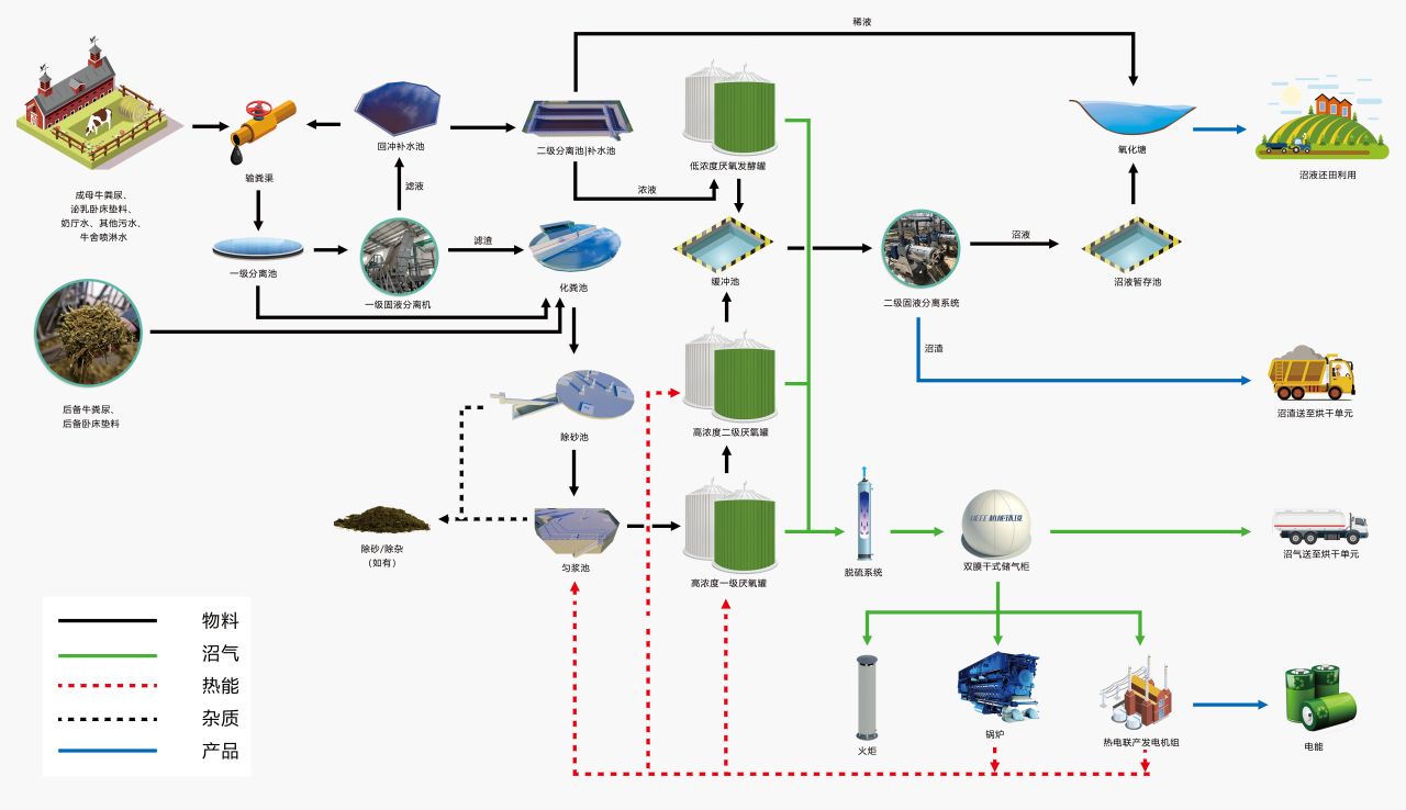 項(xiàng)目采用“原料預(yù)處理+厭氧發(fā)酵+沼渣烘干”工藝技術(shù)路線處理牧場產(chǎn)生的糞污,由預(yù)處理、厭氧發(fā)酵、沼氣凈化利用、沼液綜合利用、沼渣烘干利用等單元組成。